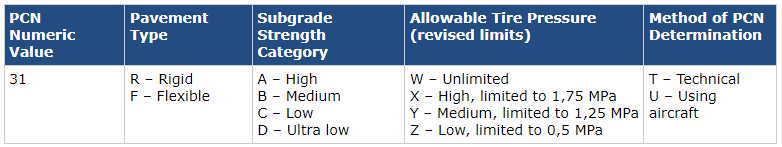 The ICAO PCN pavement strength reporting system involves publishing a five (5) part strength code in the form of 51 FDWT for flexible pavements or 62 R/B/W/T for rigid concrete pavements. If desired, PCNs may be published to an accuracy of 1/10th of a whole number. Briefly, the first number is the reported PCN value on a scale of 1 to about 130, with 1 representing a weak pavement and 130 a very strong pavement. The second part of the code is either an "F" for flexible pavement systems or "R" for rigid pavement systems. The third part is a letter code A, B, C, or D indicating the subgrade/bearing strength, with A representing a high supporting strength and D a very low strength. The fourth part indicates the tire pressure limitation in MPa if applicable (X, Y, Z otherwise W). The fifth and final part of the PCN code indicates the evaluation method used to determine the pavement strength - "T" if derived from an engineering study or "U" if based on satisfactory aircraft usage.